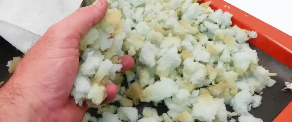 Nossas espumas são flocadas com retalhos de espumas novas, com densidades variadas, assim sendo elas vendidas em pacotes.